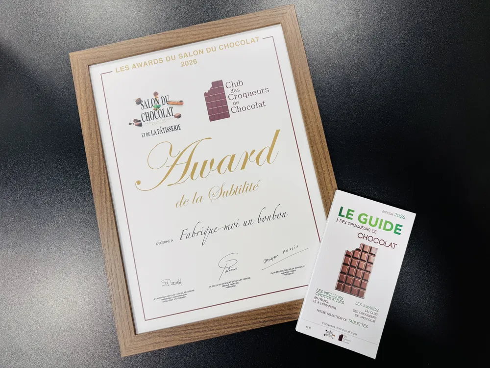 C’est avec une immense fierté que nous vous annonçons que Fabrique-moi un bonbon vient de recevoir l’Award de la Subtilité 2026, décerné par le Club des Croqueurs de Chocolat lors du prestigieux Salon du Chocolat de Paris.